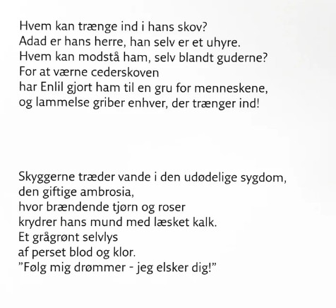 Med hvert træsnit følger tekstark med et uddrag fra det babyloniske helteepos om sagnkongen Gilgamesh og tilhørende digt/tekstlinier af Have under inspiration af Gilgamesh.
